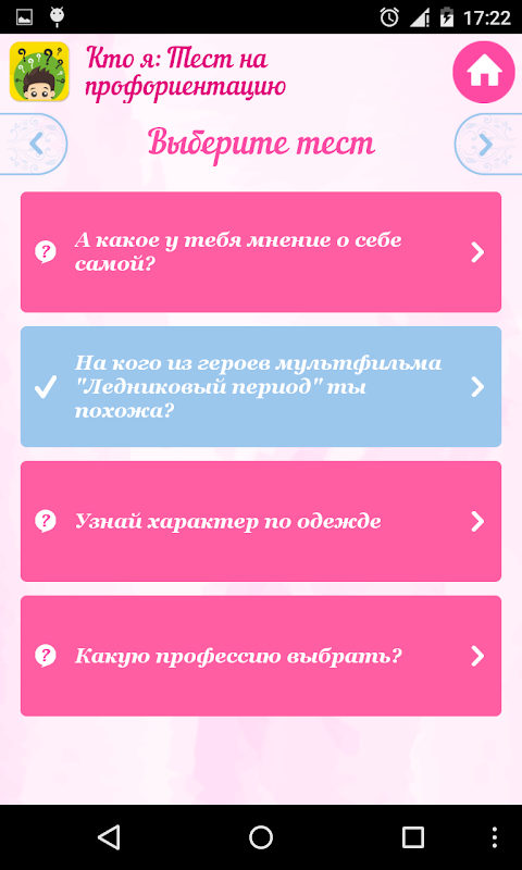 Любой из нас хотя бы однажды сталкивается с выбором будущей профессии. Но что делать, если ярко выраженной склонности к чему-либо нет, и поэтому не совсем понятно, какому варианту отдать предпочтение? На самом деле многие парни и девушки попадают в такую ситуацию, а выход из нее очень прост. И для того, чтобы сделать обдуманный и правильный выбор, достаточно установить приложение "Кто я: тест на профориентацию" и пройти специальные психологические тесты. С их помощью вы может и не получите конкретный вариант профессии, но хотя бы узнаете наиболее подходящий вам род деятельности.