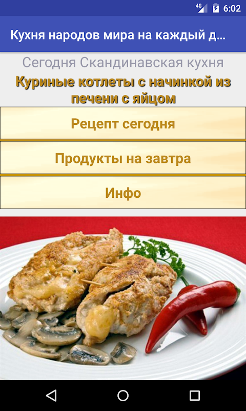 Приложение "Рецепты народов мира" предлагает Вам приготовить всего ОДИН рецепт из кулинарной кухни какой-нибудь страны. Причем, список продуктов, который потребуется для приготовления блюда, Вам предлагается заранее.