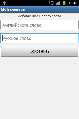 Для того что бы добавить слово - проведите пальцем в влево, что бы перейти к списку слов - проведите пальцем вправо.