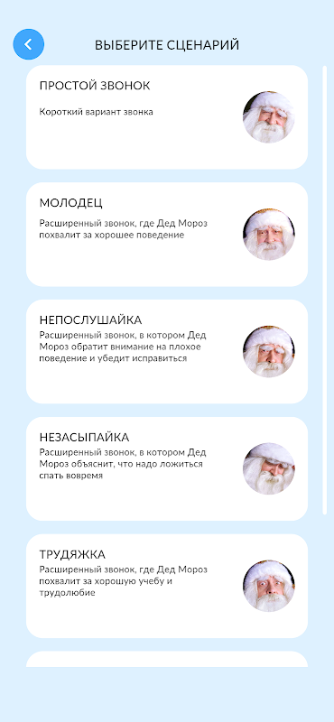 یک برنامه ساده و راحت با صدایی مهربان و تبریک صمیمانه به زبان روسی، یک تقلید واقع بینانه از تماس یک بابا نوئل واقعی روسی ایجاد می کند. این یک فرصت عالی برای ایجاد یک افسانه سال نو، حمایت از یک کودک یا جشن گرفتن دستاوردهای او است.