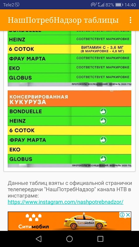 در این پیوست تمام جداول بررسی ها و تست های محصولات را مشاهده می کنید ، که توسط برنامه تلویزیونی "NashPotrebNadzor" در کانال NTV انجام می شود.