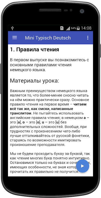 مواد برای کسانی که شروع به یادگیری زبان "از ابتدا" مفید خواهد بود. این برنامه یک صفحه ی عالی برای غوطه ور شدن در زبان است که به تدریس زبان کمک می کند. آموزش با صدا همراه است. مناسب برای بزرگسالان و کودکان و مبتدیان. این برنامه بدون اینترنت کار می کند (آفلاین).