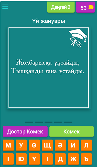Егер жұмбақтардың жауабын табу қиын болса, көмек баырмасын басыңыз, немесе достарыңыздан сұрау батырмасын