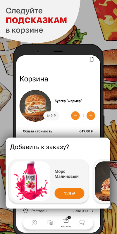 نحوه ثبت سفارش در اپلیکیشن "Daddy's Burgers": مواردی را که دوست دارید از منو انتخاب کنید، به سبد اضافه کنید و وارد صفحه پرداخت شوید (با کلیک بر روی نماد سبد).