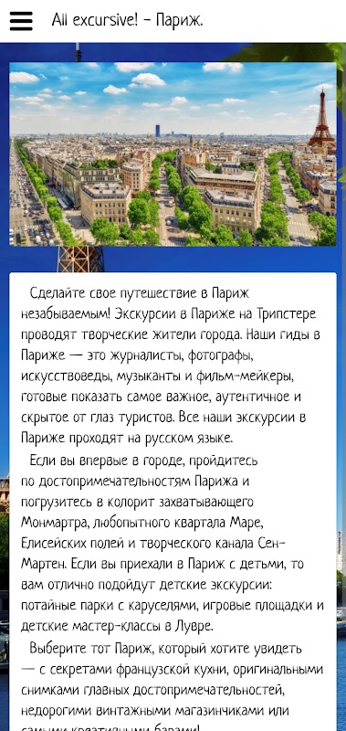 در این برنامه می توانید با پاریس آشنا شوید ، با مشاهده مناظر و بررسی های ویدئویی ، مکانی را برای سفر انتخاب کنید. این برنامه همچنین حاوی اطلاعاتی در مورد آژانس های تور و هتل هایی است که خدمات خود را در پاریس ارائه می دهند.