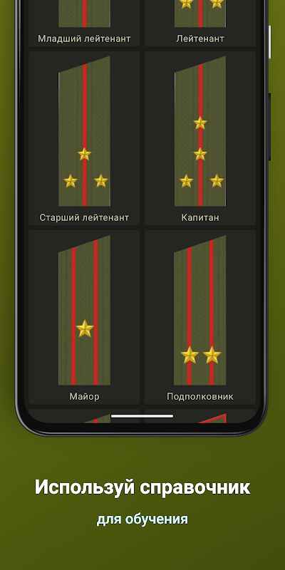 برنامه ای که به شما کمک می کند تا به سرعت و به راحتی درجات نظامی نیروهای مسلح فدراسیون روسیه را یاد بگیرید.