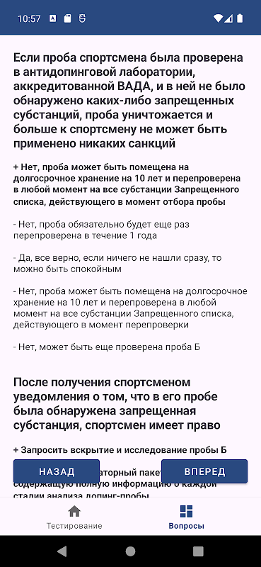 این برنامه به شما کمک می کند تا برای قبولی در تست ضد دوپینگ RUSADA و تست "ارزش های ورزش" آماده شوید. حاوی سوالات بیشتری برای سال های 2025، 2024 و 2023 است و همچنین پاسخ های صحیح را پیشنهاد می کند.