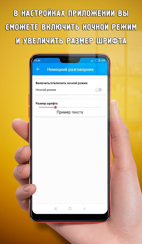 برنامه بدون اتصال اینترنت کار می کند. برای راحتی کاربران، مطالب به 64 دسته مهم تقسیم می شوند. شامل بیش از 2200 عبارت با تلفظ آلمانی و روسی، همچنین حاوی رونویسی به زبان روسی است.