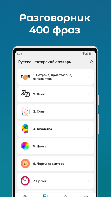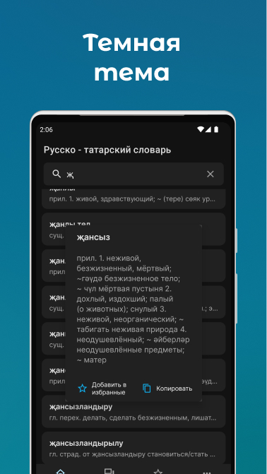 یک تابع جستجو برای یافتن سریع کلمه مورد نیاز خود در دو زبان در یک زمان وجود دارد. شما مجبور نیستید روسی-تاتاری یا تاتاری-روسی را انتخاب کنید. کلمات را در جستجو به دو زبان روسی و تاتاری وارد کنید.