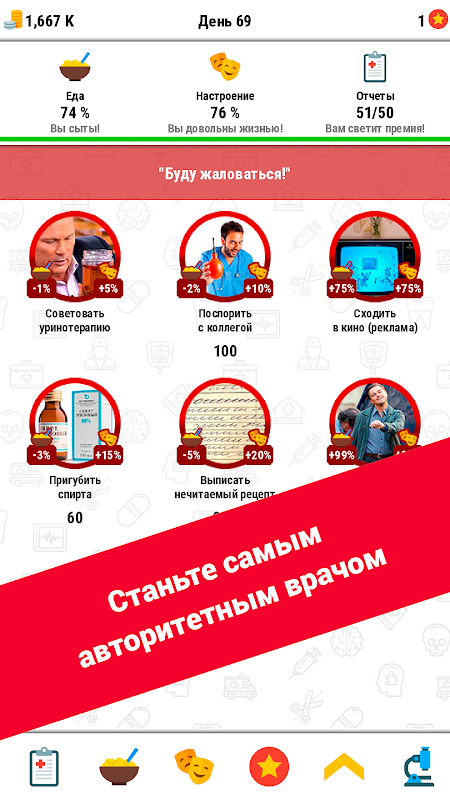 Help the suffering, but do not forget to yourself - brew a doshik on time, go to the movies and gain credibility! Discover all the achievements of a doctor’s simulator, become the most authoritative doctor and invent the Cure for All Diseases and the Pill for Old Age)