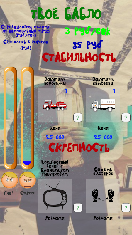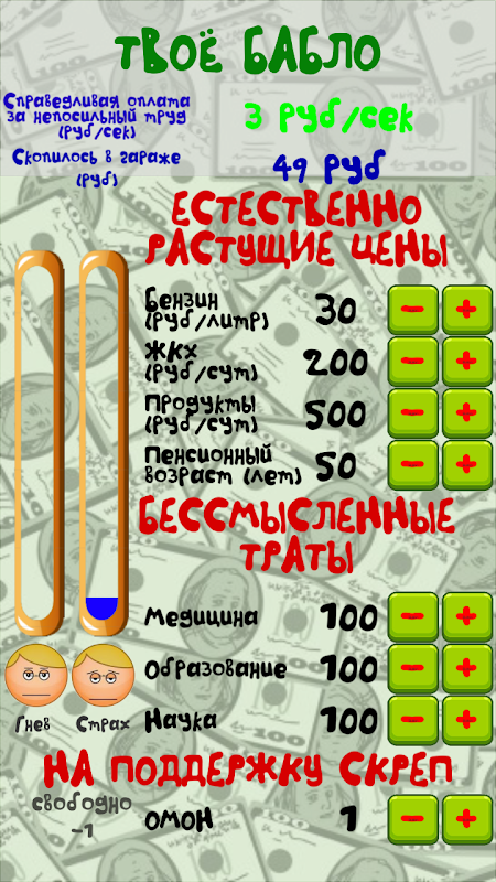 This is a simulator of a corrupt official, your goal is to rob the whole country so that the people do not overthrow you! You can raise the price of gasoline and food, or cut funding in science and health, but be careful, the anger of the people can escalate into a rally and overthrow you! Therefore, you can surround yourself with a whole army and be safe, but the army also needs to be paid. Develop your own strategy and make money! The game is completely in Russian, works offline.