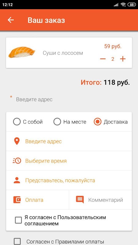 Как сделать заказ в приложении “Суши Смайл”: выберите понравившиеся позиции из меню, добавьте их в корзину и перейдите на экран оформления заказа (по нажатию на иконку корзины).