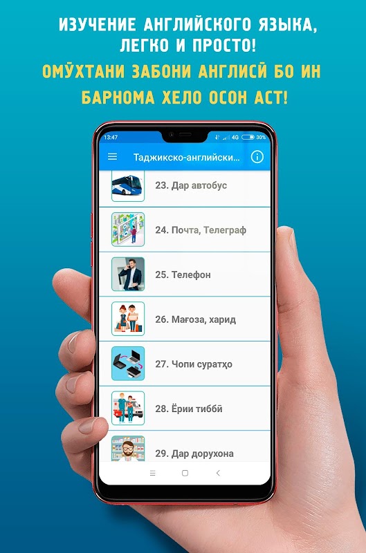 کتاب اصطلاحات تاجیکی-انگلیسی شامل کلمات و عبارات لازم با تلفظ ها که ممکن است در طول سفر یا سفر به آنها نیاز داشته باشید. این برنامه حاوی بیش از 1100 عبارات است که بر اساس موضوع با تصاویر طبقه بندی شده اند. ما همه کارها را انجام داده ایم تا یادگیری و یادگیری عبارات جدید راحت ترین!