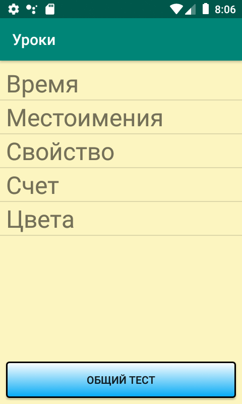 یادگیری زبان تاتاری در اپلیکیشن لغات مورد مطالعه به گروه ها تقسیم می شوند که در هر گروه می توانید تست حفظ لغات گروه را انجام دهید و در قالب لیستی از گروه ها می توانید یک تست کلی برای حفظ تمامی مطالب انجام دهید. کلمات همه گروه ها فهرست کلمات این گروه حاوی کلمه ای به زبان روسی است که ترجمه آن به صورت .