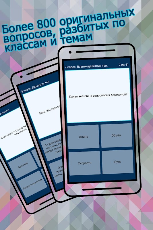 Приложение включает в себя более 800 уникальных вопросов, разбитых по классам и темам.