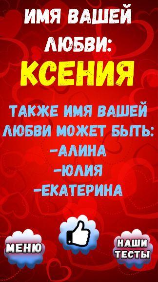Тогда установите наш тест и получите ответ на этот вопрос! Ответьте на несложные вопросы нашего теста и ты узнаешь имя своей любви. В тесте предоставляется на выбор ваш пол, поэтому скачать наш тест могут и парни, и девушки, мальчики и девочки! Большая база имен дает возможность предсказать наиболее точный результат. В этом тесте ты узнаешь какое имя будет у твоей второй половинки.
