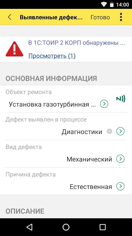 Доступ к информации в системе «1С:ТОИР 2 КОРП» дает возможность получать маршруты обходчика (наряды на регламентное мероприятие), необходимую справочную информацию и оперативно передавать документы, аудио- и видеофайлы, фото, геокоординаты, сканированные штрих-коды, NFC-метки объектов ремонта, созданные на мобильном устройстве, в базу «1С:ТОИР 2 КОРП».