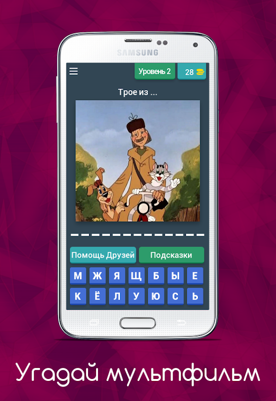 Увлекательное приложение Угадай Мультфильм - отличный способ провести свободную минуту в любом месте: в транспорте, в очереди или сидя за столиком в кафе. Викторина построена по принципу шоу Поле Чудес, Угадай кто по фото и картинкам, и подразумевает отгадывание слов - известные детские мультфильмы: отечественные, советские и иностранные, которые вы могли видеть в ютубе, окко, иви, кинопоиске и по телевизору. В игре доступно 48 уровней без интернета, оффлайн, а остальные нужно докачивать из облака и это всё абсолютно бесплатно. К услугам пользователя подсказки, кнопка Помощь Друзей и деньги, используя которые можно показать одну из букв, убрать ненужные буквы или перейти на следующий уровень, чтобы отгадывать другие мультики, кино для детей.