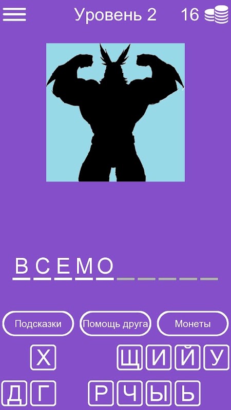 Принцип игры достаточно прост: Показывается картинка с персонажем из аниме и мангой Boku no Hero Academia, а вам предстоит ввести его имя. Если вы не можете дать правильный ответ, можно воспользоваться 3 видами подсказок: убрать лишние буквы, открыть букву, открыть всё слово.