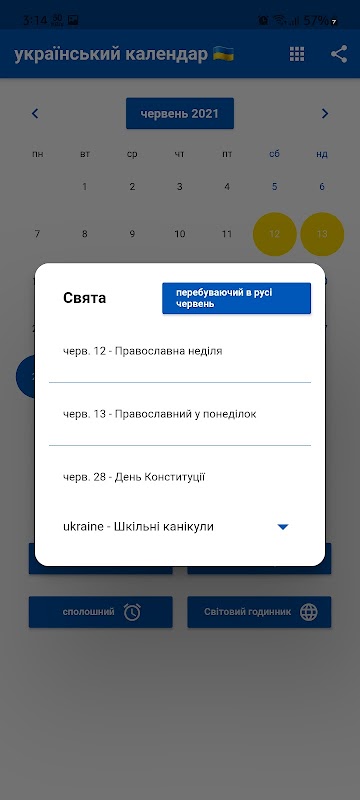 تقویم اوکراینی دارای تعطیلات ، یادآوری ، ماشین حساب ، ساعت زنگ دار است.