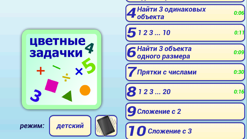 همه در بازی بیش از 30 سطح آزاد: یک یا چند مورد که نشانه همان را انتخاب کنید، ایجاد یک دنباله از اعداد از 1 تا 10 یا 1 تا 20، نمونه هایی از جداول علاوه بر این، جدول ضرب و کارهای دیگر.
