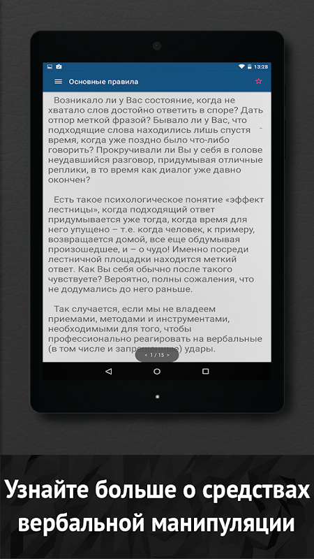 Это приложение поможет Вам: отличать, в каком контексте и при каких вопросах ваши аргументы ничего не значат или, наоборот, являются решающими; устранить противоречия в разговоре с собеседником; научитесь правильно использовать различные вербальные уловки; находчиво и элегантно устранить поставленные для Вас ловушки; в горячих спорах не терять головы и вести себя уверенно, выучите некоторые ядовитые фразы, а так же многое другое!
