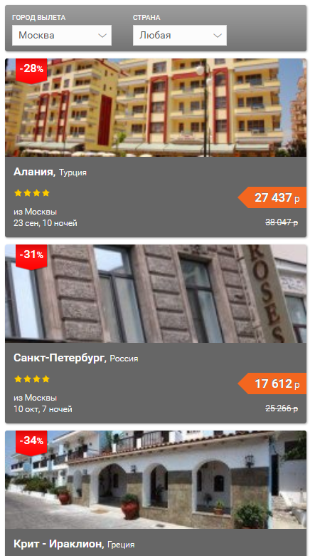 تورهای تخفیف به ترکیه، سفر در آخرین لحظه به تایلند، در آخرین لحظه در اسپانیا، تعطیلات ارزان در یونان، سفرهای در آخرین لحظات به Goa (هند)، آخرین turputevku به پراگ (جمهوری چک) و قبرس، تور به ایتالیا، مجارستان، همه چیز برای انجام در اتریش، در آخرین لحظه تورهای در امارات متحده عربی (امارات)، تعطیلات در بالی (اندونزی)، تورهای ارزان به ویتنام و کامبوج تور در اسرائیل، تورهای در روسیه، سفرهای در آخرین لحظه به مالدیو و سیشل، سفر به تورهای موریس به کوبا و جمهوری دومینیکن، putevkivo فرانسه ، تونس، مراکش، مکزیک و بسیاری دیگر از کشورهای جهان.