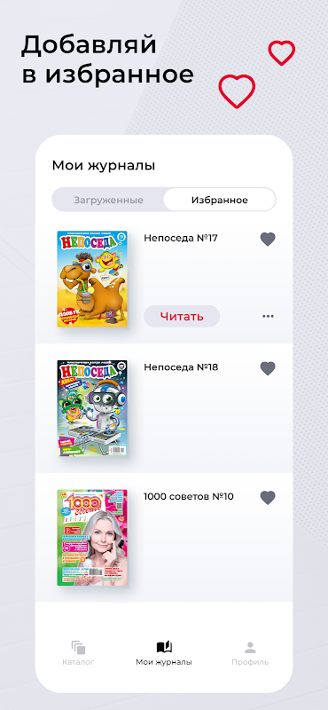 - Добавление в Избранное. Добавляйте в избранное любые издания, чтобы читать их позже. Последние добавленные в избранное отображаются первыми