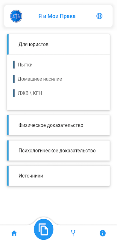 The mobile application contains recommendations for victims of violence (victims of torture, domestic violence, people living with HIV, military personnel), lawyers, psychologists and doctors, in particular, their rights and guarantees are explained; legal protection mechanisms; assessing the physical and psychological consequences of violence; compensation for damage; contacts of law enforcement agencies, the institution of the Commissioner for Human Rights and non-governmental organizations that are directly involved in the investigation of these categories of cases and the provision of free legal, medical and psychological support.