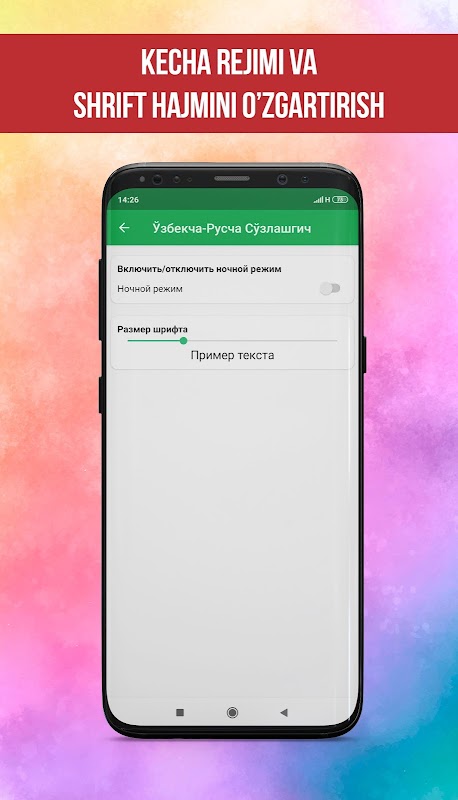 • Возможность настройки приложения: изменение размер шрифта и ночной режим (ночной режим применен: на под категории, поиск и избранное)