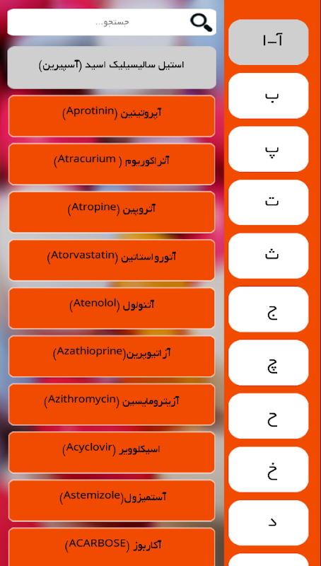 جهت استفاده ی راحت تر، داروها را به ترتیب حروف الفبا مرتب نموده ایم تا بتوانید به راحتی داروی مورد نظر خود را پیدا نمایید و به اطلاعات آن دسترسی پیدا نمایید.