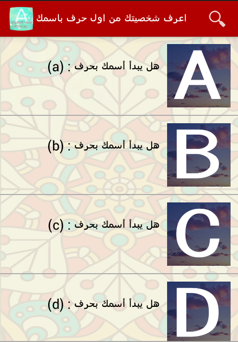 من خلال هذا التطبيق تستطيع معرفة شخصيتك من أول حرف من أسم ببساطة من خلال اختيار حرف اسمك الأول من قائمة الحروف،