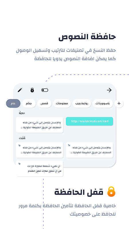 یک ابزار انحصاری برای صفحهکلید عربی، یک پوشه متنی پیشرفته که در پوشه چند کپی ادغام شده است. میتوان دستهها را در داخل آن اضافه کرد تا کپیها مرتب شوند یا مستقیماً بدون کپی به آنها اضافه شوند. برای مثال، ایمیل را میتوان در یک دسته اضافه کرد. برای ایمیلها برای تسهیل دسترسی به آنها در صورت نیاز برای استفاده از آنها، ذخیره پستها یا یادآوریها، یا پیوندهایی به سایتهای مهمی که میخواهید بعداً به آنها بازگردید.