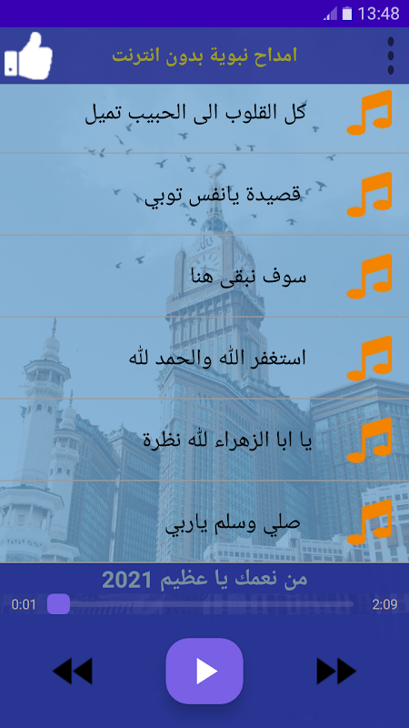 أدخِل ملاحظات اتطبيق امداح نبوية بدون انترنت يقدم لك مجموعة من الأمداح النبوية المختارة بعناية لتستمع إليها في أي وقت ومن دون الحاجة إلى الاتصال بالإنترنت.