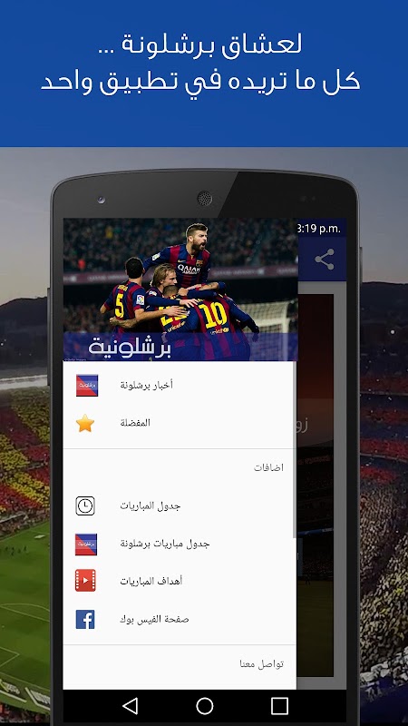 ✔ صفحة فيس بوك "برشلونية": يمكنك التفاعل مع باقي مستخدمين التطبيق من خلال الصفحة الرسمية للتطبيق و التعليق على آخر الأخبار و المباريات.