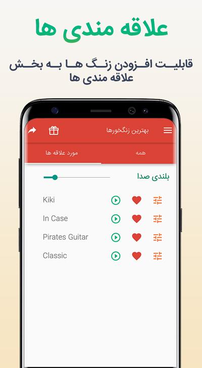 - دارای بخش های زنگ تلفن ، زنگ اعلان، زنگ ساعت، زنگ مخاطب خاص و لیست علاقه مندی های شما