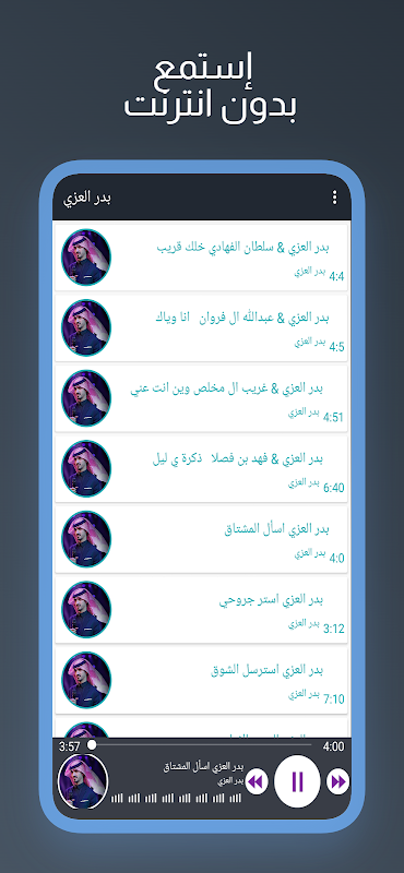 اپلیکیشنی که شامل تمامی هنرمندان جدید، قدیمی و انحصاری بدر العزی بدون نیاز به اتصال به اینترنت با بروزرسانی مداوم است.