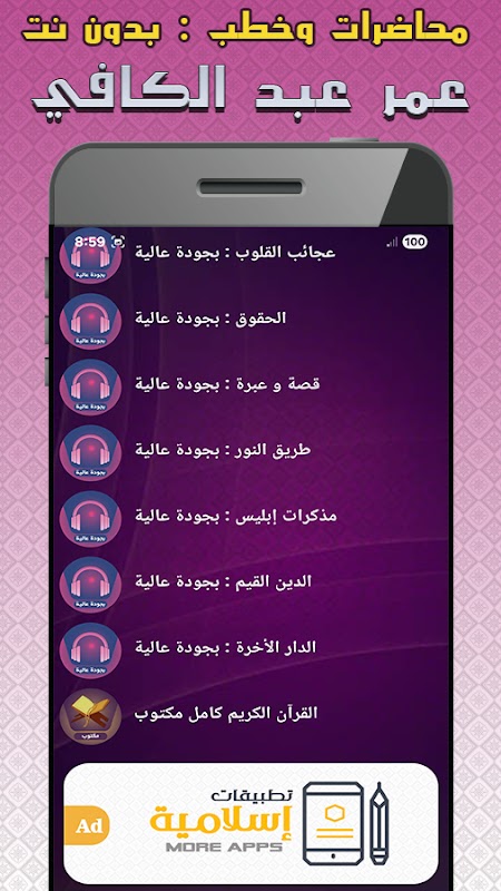 این برنامه شامل خطبه ها و سخنرانی های شیخ عمر عبدالکافی بدون دسترسی به اینترنت و بیش از 700 سخنرانی با کیفیت بالا می باشد.