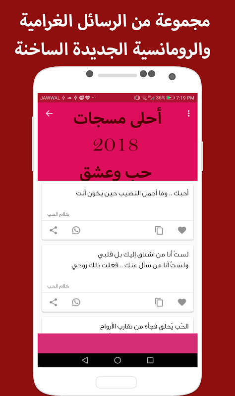 حمل تطبيق مسجات حب 2018 ولا تتردد ، هنا تجد الكثير ولن تحتاج تطبيقات اخرى غير تطبيق مسجات واتس اب 2018 .
