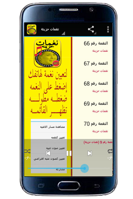 نغمات حزينة بدون أنترنت يحتوي على أكثر من ( 70 ) نغمه أو رنات جوال يمكنك الاستماع للنغمات أو الرنات مع تكرار جميع الرنات ودون توقف أو اختيار رنة أو نغمه واحده لتكرارها عدة مرات للاستماع .