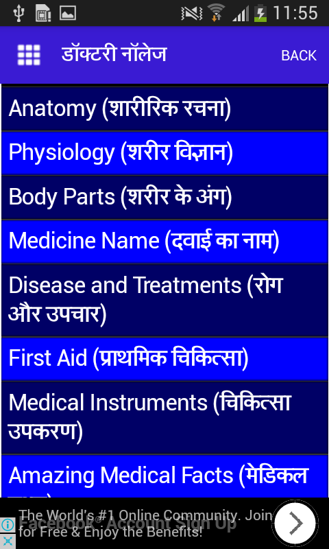 This app provide the various facts and gain knowledge to live a healthy life. This application provide you knowledge about medicine dictionary, hair promblem, Skin Disease and Treatment, Heart Disease Treatment,Ear Nose & Throat disease and treatment etc.