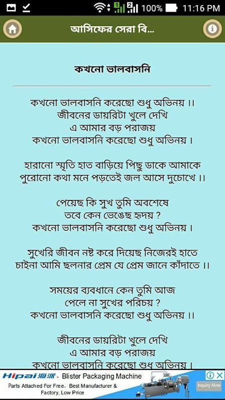 এই সময়ের সাড়াজাগানো যত বাংলা গান রয়েছে আসিফের গান সবচেয়ে জনপ্রিয়তার সবচেয়ে। বাংলাদেশে এমন কোন মানুষ খুঁজে পাওয়া যাবে না যে আসিফ এর গান পছন্দ করে না। যদিও আসিফ কয়েকশত গান গেয়ে তাঁর শ্রোতাদের মন জয় করেছেন, আমরা এই অ্যাপ এ আসিফ এর সকল জনপ্রিয় গানগুলো একসাথে করেছি। আপনারা অনেকেই আসিফ এর গান শুনার পাশাপাশি মুখুস্থ করতে চান তাঁদের কথা চিন্তা করে আমরা আসিফের গানের লিরিক্স দিয়েছি যা আপনি খুব সহজেই পড়তে পারবেন। আসিফের সাড়াজাগানো এই সকল গানগুলো বাংলাদেশের প্রত্যেকটি মানুষের হৃদয়ে মিসে আছে। আমাদের এখানে রয়েছে আসিফ এর কষ্টে গান, আসিফের ভালোবাসার গান, আসিফ এর দেশের গান ইত্যাদি। আমাদের এই আসিফের গানগুলো মুলত ঐ সকল আসিফের ভক্তদের জন্য যারা ভালোবাসা হারিয়েছেন এবং ভালোবাসার কষ্ট যাদের মনের ভিতরে। কষ্টের এই সকল বাংলা গান আপনার মনের জ্বালা কিছুটা হলেও কমাবে।