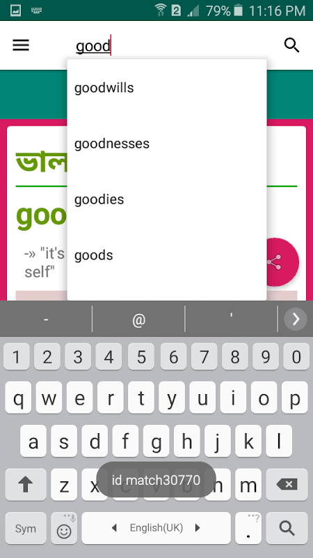 تقریباً تمام زبان بنگالی که برای برقراری ارتباط و برقراری ارتباط در زندگی روزمره خود استفاده می کنیم در این برنامه است. خیلی سریع می توانید یک کلمه انگلیسی را تایپ کنید و بنگالی آن را ببینید. در اینجا شما حدود 1 هدف (نزدیک) کلمات انگلیسی به بنگالی را پیدا خواهید کرد.
