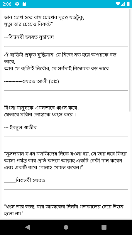 এই অ্যাপটির মধ্যে আমরা অনেক গুলি হাদিস এসএমএস আঁকারা তুলে ধরেছি. এই হাদীসগুলো সহীহ বুখারী، সহীহ মুসলিম، আল কোরআন، তিরমিযী শরীফ، বিশ্বনবী হযরত মোহাম্মদ (সঃ) কিছু গুরুত্বপূর্ণ ও বাছাইকৃত হাদীস তুলে ধরা হয়েছে.