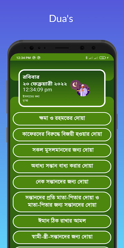 چاقوی کوچک، واز محفل از 10 عالم مفتی برتر بنگلادش، 30 جزء تلاوت قرآن، تسبیح دیجیتال، ماشین حساب زکات، مسایل المساله، 99 نام الله، محل مسجد، قطب نما کابل و غزل بنگلادش. این اولین برنامه ای هست که ساختم امیدوارم اگر اشتباهی هست با بخشش ببینید سعی میکنم در آپدیت بعدی درستش کنم انشاالله امیدوارم همکاری شما اگر از برنامه من سودی دارید، باید با بررسی بروید.