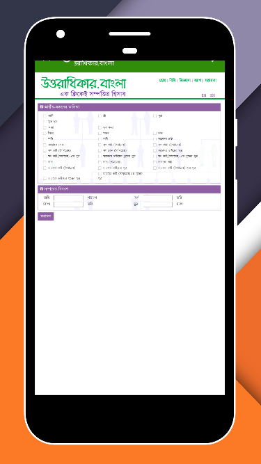 সুপ্রিম কোর্টের ওয়েবসাইটে দেয়া জুডিশিয়াল বিচার (বিচার বিভাগীয় বাতায়ন) ‘উত্তরাধিকার.বাংলাবাংলাতে এক ক্লিকেই সম্পত্তির হিসাব করা যায় যায় অ্যাপে ঢুকে বাংলা বা ইংরেজী যেকোনো ভাষায় একটি ফর্ম পূরণ করে জানা যাবে উত্তরাধিকারের সম্পত্তির হিসাব।