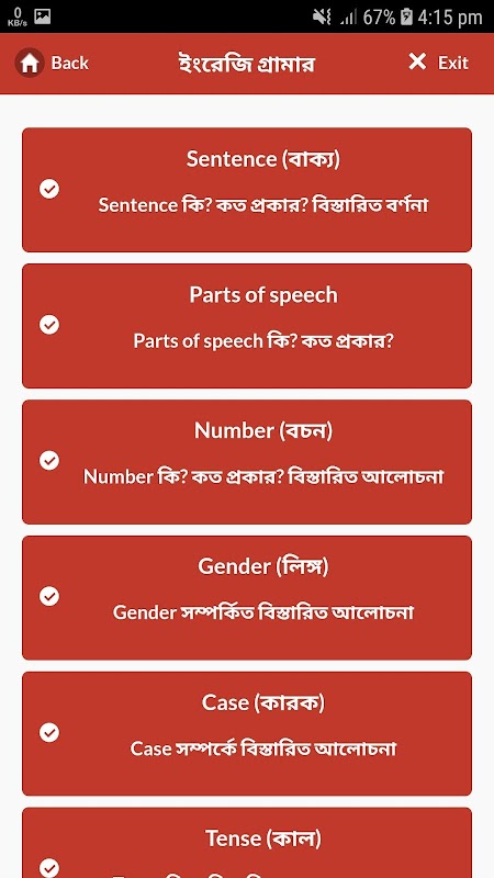 Every Bangla to English learning chapter is sufficiently provided with examples and practice exercises. This is the best Bengali to English speaking app that you will find full of information and completely free.