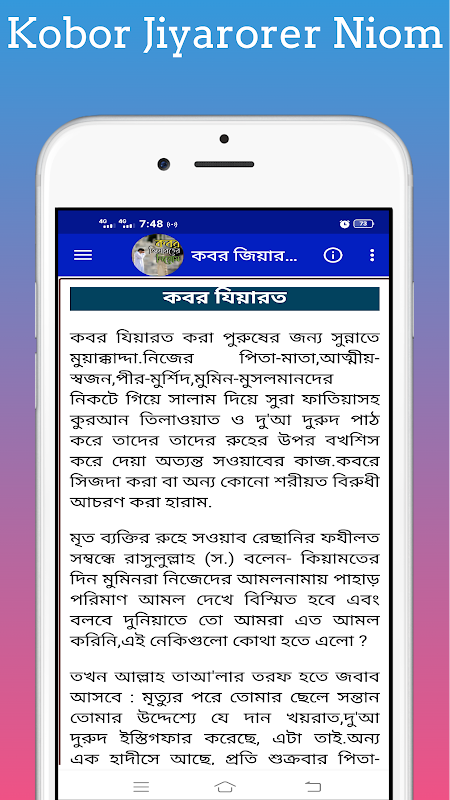 شما می توانید با این برنامه Kobor Jiaroter Niom یعنی قانون زیارت قبر را یاد بگیرید.شما می توانید اطلاعات بیشتر در مورد kabor jiyarat یا koborer doa را از این برنامه یاد بگیرید انشاالله.