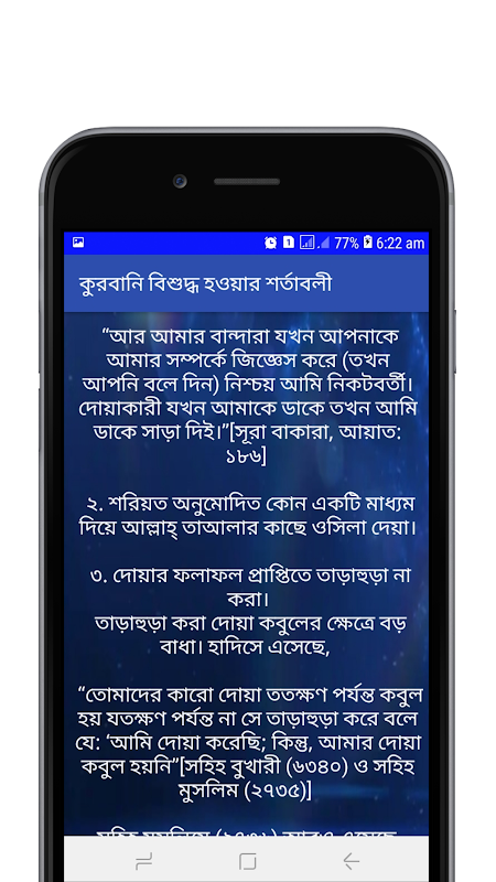 কুরবানী এর মাসায়েল জানা সবার জন্য অত্যন্ত জরুরি. কুরবানী এর নিয়ম ও ইতিহাস জানলেই কুরবানীর গুরুত্ব সবাই উপলব্ধি করতে পারবে ।কুরবানী ঈদ বা ঈদুল আযহা মুসলমানদের জন্য দ্বিতীয় আনন্দময় ধর্মীয় উৎসব।কুরবানি (Qurbani) কুরবানীর মাসায়েল একটি বাংলা ইসলামিক অ্যাপ।কুরবানী Qurbani অর্থ ত্যাগ। ঈদুল আযহা (eidola Asha) মূলত ত্যাগের উৎসব। কুরবানির সময় মুসলমানেরা তাদের সাধ্যমত আল্লাহর সন্তুষ্টি অর্জনের জন্য উট, গরু, দুম্বা কিংবা ছাগল কোরবানি বা জবাই করে। মহান আল্লাহ পাক পবিত্র কোরআন শরীফে কুরবানীর ইতিহাস সম্পর্কে সুন্দর বর্ননা দিয়েছেন যা থেকে আমরা কুরবানির গুরুত্ব ও তাৎপর্য বুঝতে পারি।কুরবানি বা কোরবানি দেওয়ার সুন্নাহ রয়েছে। যে কোনো ভাবে , একটা পশু জবাই করলেই কুরবানি বা কুরবানী হয় না। যেমন একটি মাসালা বা মাসায়েল হচ্ছে, ঈদুল আযহার নামাজের আগে কুরবানি করা সঠিক নয়- এরকম কেউ করলে কুরবানী বা কোরবানি হবে না।