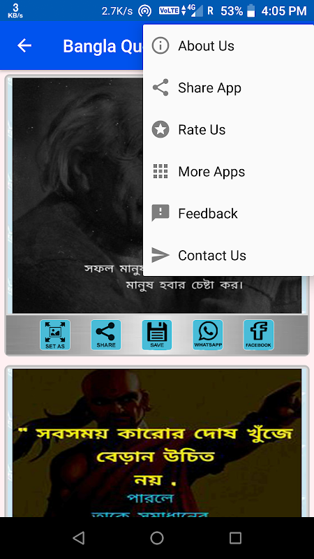 برنامه تصویر Bangla quotes یک برنامه اندرویدی خارق العاده است. خواندن و به اشتراک گذاشتن به عنوان تصویر با دوستان و خانواده خود بسیار آسان است. استفاده از این نرم افزار بسیار آسان است و شما می توانید به راحتی از طریق whatsapp ، facebook و غیره تصویر را با بچه های خود به اشتراک بگذارید. این شامل انواع مختلفی از نقل قول ها است ، هر به روزرسانی ما qout های جدید اضافه می کنیم و دسته های جدید اضافه می کنیم. این برنامه حاوی برخی از ویژگی های شگفت انگیز مانند setas ، ذخیره ، اشتراک و غیره است. شما به راحتی می توانید قیمت ها را به عنوان کاغذ دیواری ، نمایه whatsapp تنظیم کنید. شما همچنین تصویر نقل قول های خود را در فضای ذخیره سازی تلفن همراه خود ذخیره می کنید و این برنامه همچنین به شما امکان می دهد تا مستقیماً qoutes خود را با whatsaap ، facebook و غیره به اشتراک بگذارید.